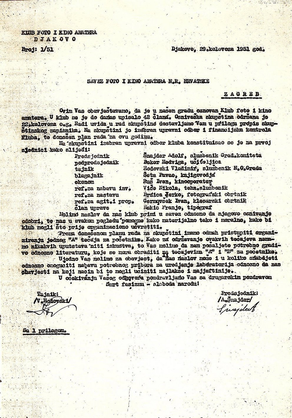 Grupa ljubitelja fotografije odlučila je mjeseca kolovoza 1951. sazvati Osnivačku skupštinu KLUBA FOTO I KINO AMATERA u ÐAKOVU. To se i dogodilo 22. kolovoza o čemu svjedoči pismo upućeno Savezu foto i kino amatera Narodne republike Hrvatske u Zagrebu. Od tada Klub neprekidno radi – u početku više prevladava fotoamaterizam. Tek koncem 50-ih godina privatnom kamerom Ivana Germovšeka – mini kamerom za uski film 2×8 mm razvija se i filmski amaterizam.